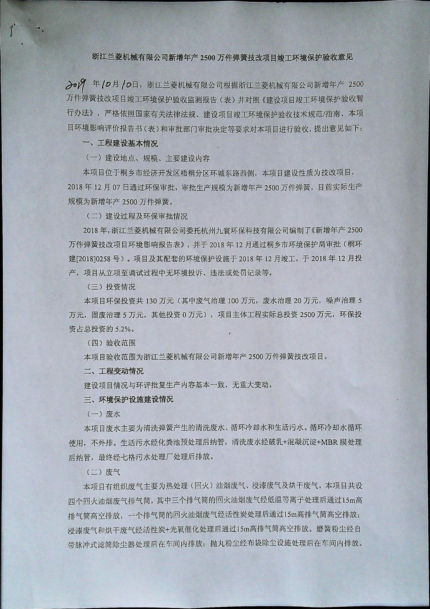 浙江蘭菱機械有限公司新增年產2500萬件彈簧技改項目竣工環境保護驗收意見